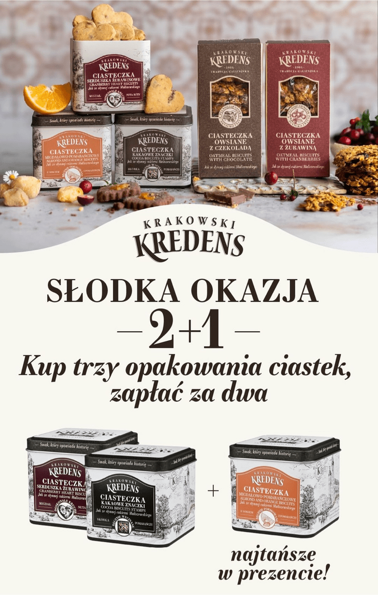 Słodka okazja! Kup 3 szt ciasteczek w puszcze lub kartoniku z Krakowskiego Kredensu i zapłać tylko za 2!