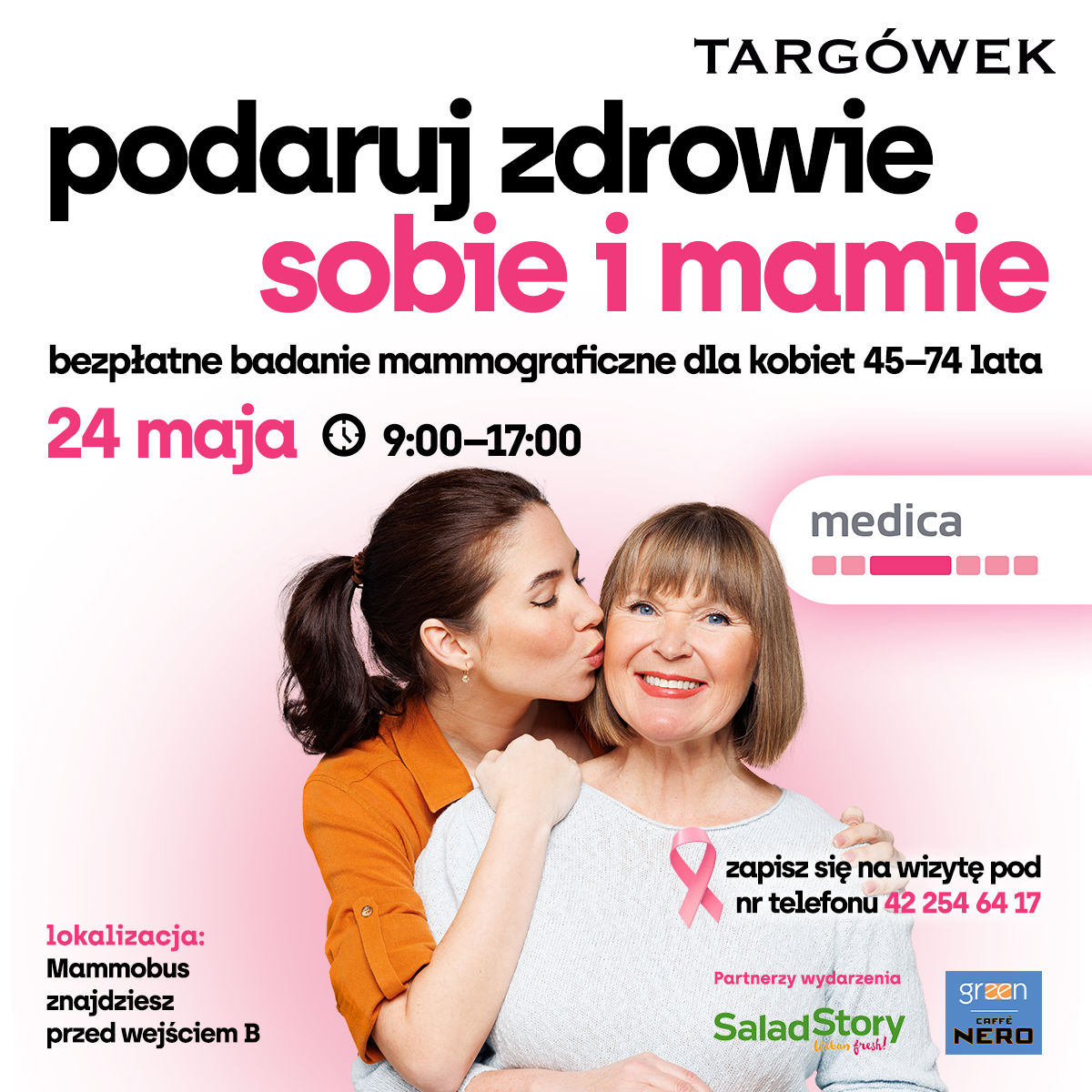 Dzień Matki to doskonała okazja, by pomyśleć zdrowiu swojej mamy i swoim. 24 maja w godzinach 9:00-17:00 każda kobieta w wieku 45-74 lata (która nie miała mammografii w ciągu ostatnich 2 lat) będzie mogła skorzystać z bezpłatnego badania mammograficznego w ramach programu profilaktycznego NFZ. To szybkie i bezbolesne badanie może uratować życie – nie przegap tej szansy! Dołącz do tysięcy kobiet, które regularnie dbają o swoje zdrowie.